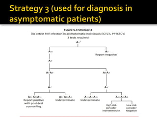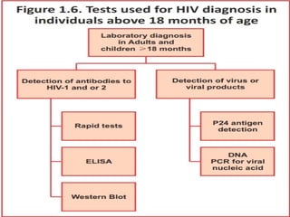 - HIV diagnosis involves antibody and antigen tests, while treatment and monitoring involves CD4 counts and viral load tests.