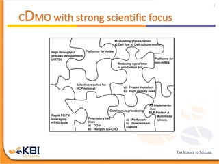The document outlines the development and manufacturing processes for HIV vaccines, focusing on high throughput process development (HTPD) and innovative cell line technologies. It discusses the production cycle, challenges in glycosylation, and the integration of various processes to enhance manufacturing efficiency, capacity, and product quality. Additionally, it highlights advancements in technology and methodologies to improve both upstream and downstream processes in the vaccine development lifecycle.