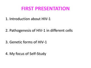This document summarizes HIV-1 pathogenesis with a focus on genetic forms. It discusses how HIV-1 enters cells through envelope protein binding and membrane fusion. The virus infects CD4+ T cells and dendritic cells, forming syncytia. It describes the structure and roles of the envelope glycoproteins GP120 and GP41 in fusion. The document also outlines the major genetic subtypes and recombinants of HIV-1 globally. It concludes that HIV-1's high genetic variability poses challenges for vaccine and drug development.
