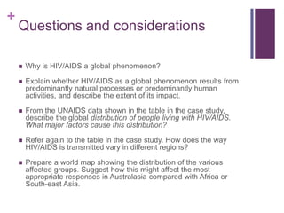 HIV/AIDS is a global issue that disproportionately affects developing countries and vulnerable groups. By 2000, over 34 million people worldwide were living with HIV/AIDS, with 95% residing in developing nations. Responses have included prevention education programs, working to increase access to low-cost treatment, and addressing underlying social and economic factors that increase risk. One such program is the National Highway One Project in Vietnam, which aims to reduce transmission along major transport routes through community outreach and encouraging behavior change.