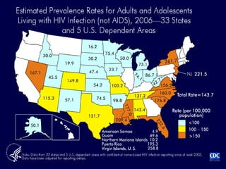 HIV/AIDS originated from chimpanzees in Africa and likely entered the US in the 1970s. In the 1980s, clusters of illnesses in gay men led to the identification of HIV and the disease being named AIDS. The Ryan White CARE Act provided funding for people with HIV/AIDS. Currently over 1 million people live with HIV/AIDS in the US, with higher rates among African Americans and men who have sex with men. Prevention focuses on abstinence, monogamy, and condom use.