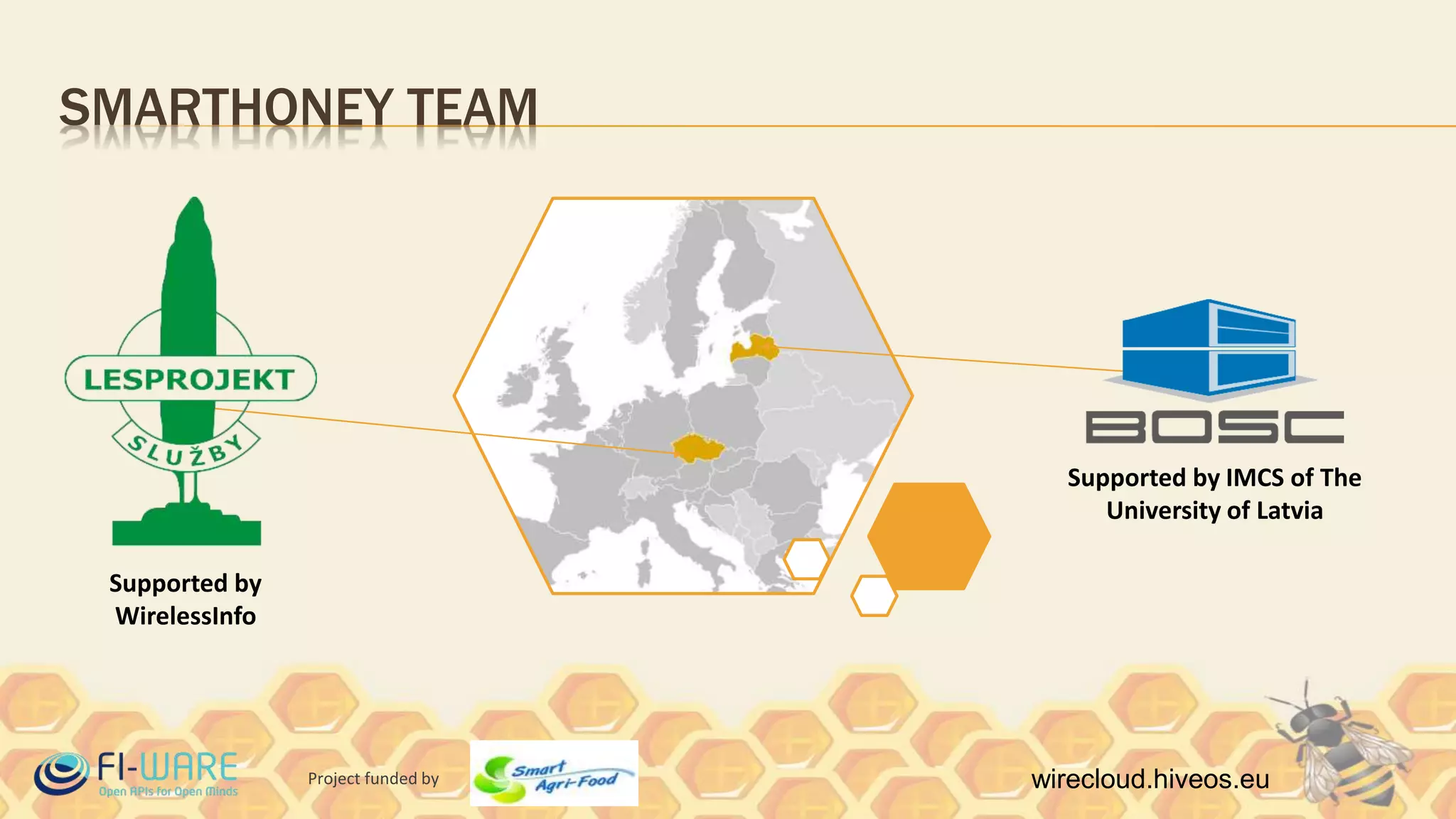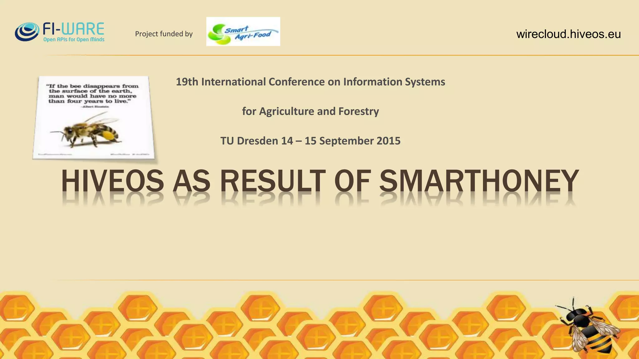 1) HiveOS is a project that developed a remote monitoring system for bee hives using sensors to track conditions inside and outside hives and bee activity.