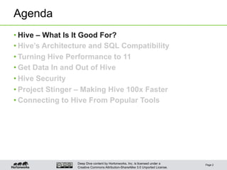 This document provides an overview of Hive and its performance capabilities. It discusses Hive's SQL interface for querying large datasets stored in Hadoop, its architecture which compiles SQL queries into MapReduce jobs, and its support for SQL semantics and datatypes. The document also covers techniques for optimizing Hive performance, including data abstractions like partitions, buckets and skews. It describes different join strategies in Hive like shuffle joins, broadcast joins and sort-merge bucket joins and how they are implemented in MapReduce. The overall presentation aims to explain how Hive provides scalable SQL processing for big data.