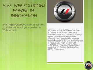 HIVE Web Solutions is a Philippine-based IT business that provides web design, development, and online marketing services including SEO. Their core offerings are web development, systems engineering, graphics design, open source consulting, web services, and technical support. They also provide a wide range of web marketing and SEO services such as keyword research, on-page optimization, link building, content writing, and social media optimization. HIVE follows best practices for quality and avoids automated or questionable tactics to ensure clients get long-term value and results.