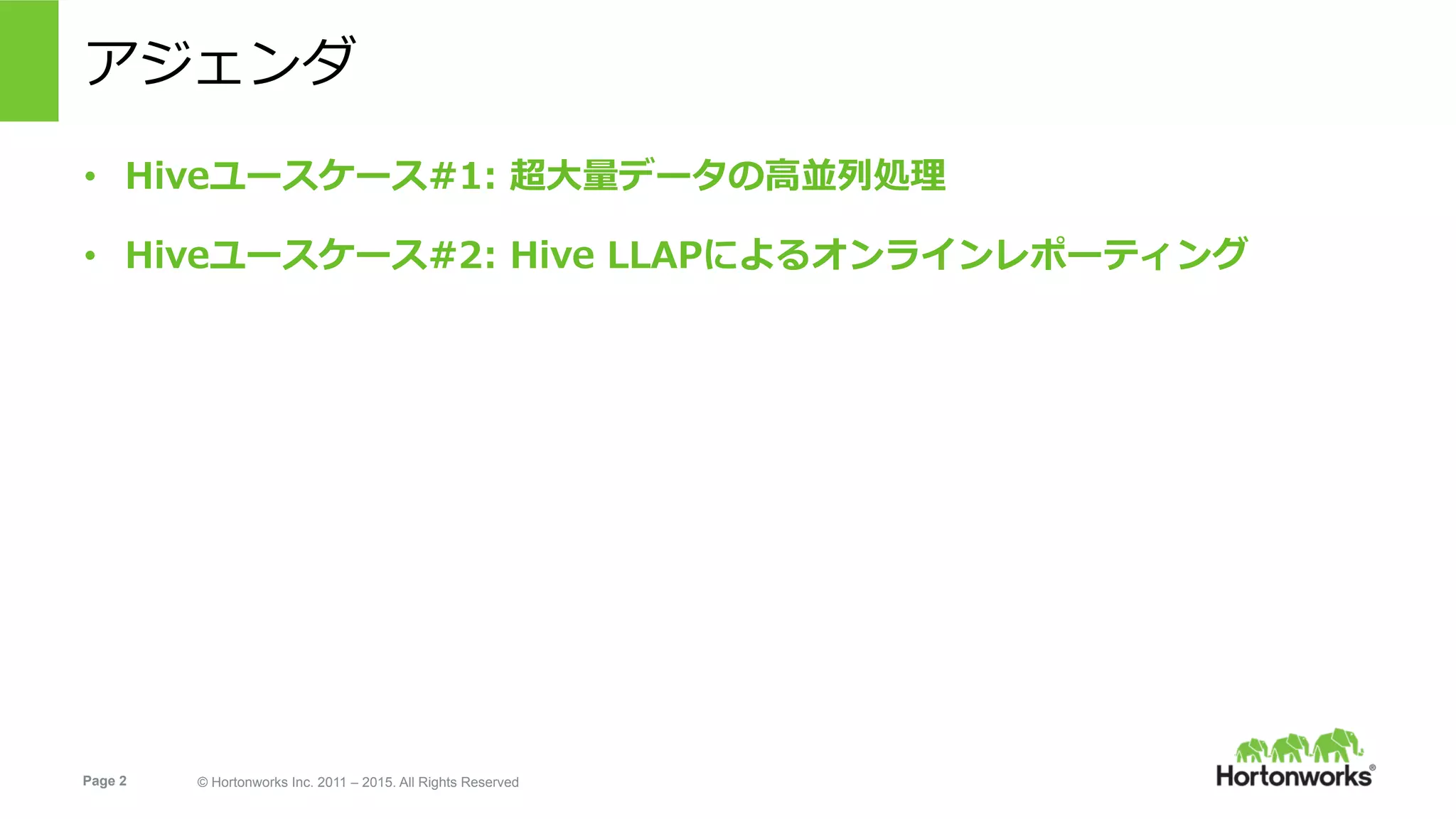 Hortonworks Inc. 2011 – 2015. All Rights Reserved アジェンダ • Hiveユースケース#1: 超⼤量データの⾼並列処理 • Hiveユースケース#2: Hive LLAPによるオンラインレポーティング