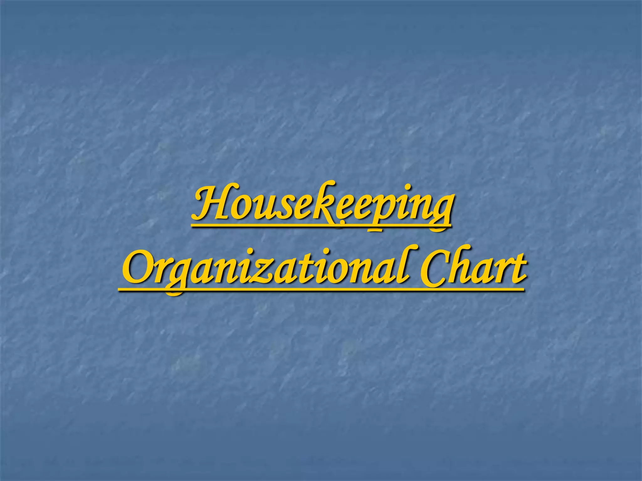 The document provides an overview of the housekeeping organizational structure and roles for different sizes of establishments. It outlines the responsibilities of key housekeeping positions such as the Executive Housekeeper, Rooms Maintenance Supervisor, Public Area Supervisor, Room Attendant, and Mini Bar Attendant. The Executive Housekeeper oversees all housekeeping operations including planning, budgeting, problem solving, and staff supervision. Supervisors direct specific areas like rooms and public spaces to ensure cleanliness standards are met. Room attendants are responsible for cleaning and maintaining assigned guest rooms.