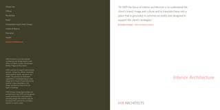 The document discusses HKR, an international architecture and design practice. It focuses on their interior architecture work. HKR has expertise in workplace, retail, and hospitality interior design. They aim to understand their clients' needs and translate them into interior spaces that support the clients' strategies and cultures. The document provides examples of HKR's interior architecture projects for offices, including strategic workplace planning and refurbishment projects.