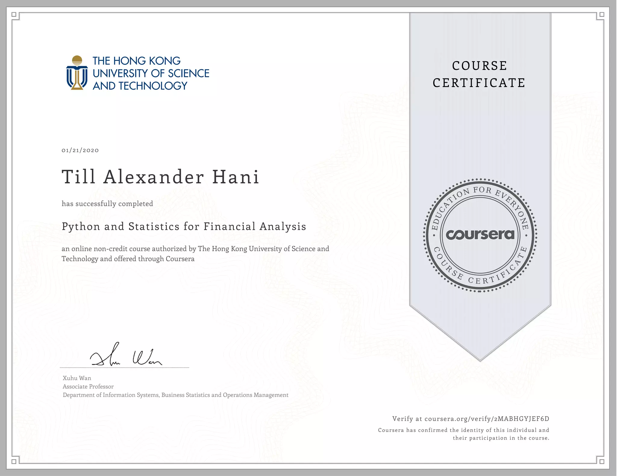 This document is a course completion certificate for Till Alexander Hani from an online Python and Statistics for Financial Analysis course through Coursera. The certificate confirms that Hani successfully completed the non-credit course on January 21, 2020. It was authorized by The Hong Kong University of Science and Technology and verified by Associate Professor Xuhu Wan.