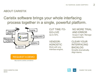 Chapter 6 of the HL7 Survival Guide discusses the importance of creating detailed interface specifications and HL7 conformance profiles to facilitate effective interfacing between systems. It outlines key elements that should be included in these specifications, such as interface names, message types, and data types, as well as the risks associated with implementing a generic interface. The chapter emphasizes the necessity of gathering requirements upfront to avoid troubleshooting and inefficiencies during the go-live phase.