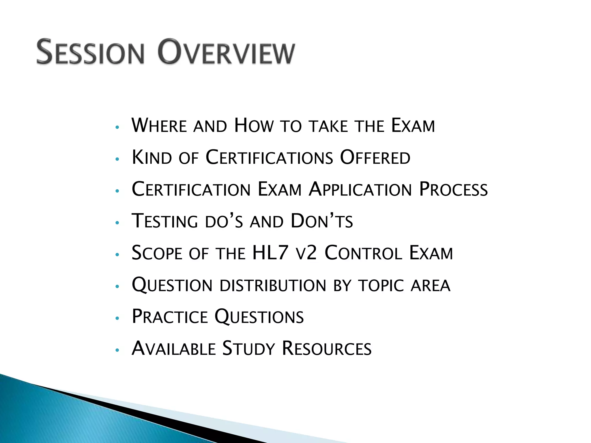 This document provides information about HL7's certification exam for HL7 v2 Control, including how to take the exam, certifications offered, the application process, testing policies, exam scope and structure, available study materials, and sample exam questions. The exam consists of 70 multiple choice questions covering HL7 v2 Control chapters and is designed to test understanding of HL7 v2 messaging concepts, construction and processing rules, control segments, datatypes, and conformance. Exam questions address topics such as trigger events, acknowledgment protocols, segment attributes, field rules, and sample HL7 messages.
