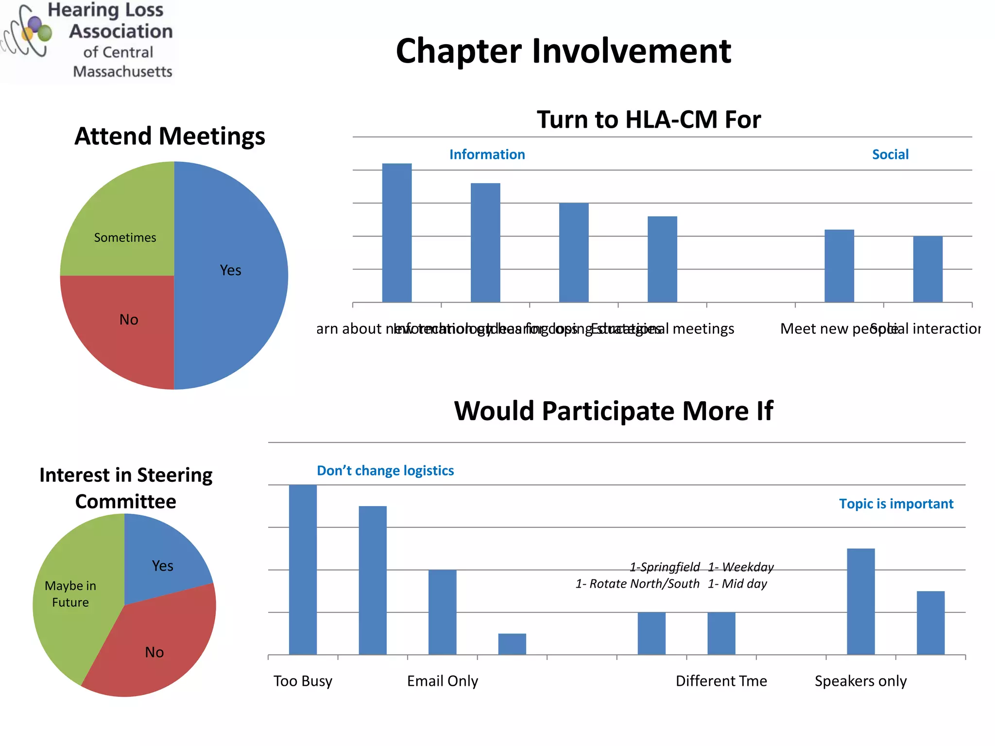 3) Members would be more likely to participate if meetings were held on weekdays, rotated locations, and had engaging topics.