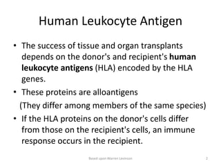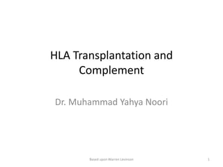 This document discusses HLA transplantation and the complement system. It begins by explaining that the success of organ transplants depends on donor and recipient HLA proteins matching. It then describes that HLA proteins are encoded by genes in the MHC located on chromosome 6, and are classified as class I or II proteins. The document provides details on MHC protein structure and expression, as well as the biological importance of MHC in antigen presentation and T cell recognition. It defines types of transplants and explains transplant rejection processes. Finally, it gives an overview of the complement system, describing its activation pathways and roles in immune responses like opsonization, chemotaxis, and cytolysis.