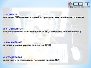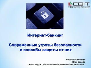 Документ посвящен современным угрозам безопасности в интернет-банкинге и методам защиты от них. Описываются эволюция хакерства, основные способы мошенничества с использованием вредоносного ПО и рекомендации по обеспечению безопасности систем дистанционного банкинга. Включает практические меры защиты, такие как использование одноразовых паролей и мониторинг транзакций.