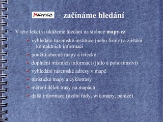 ● V této lekci si ukážeme hledání na stránce mapy.cz