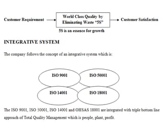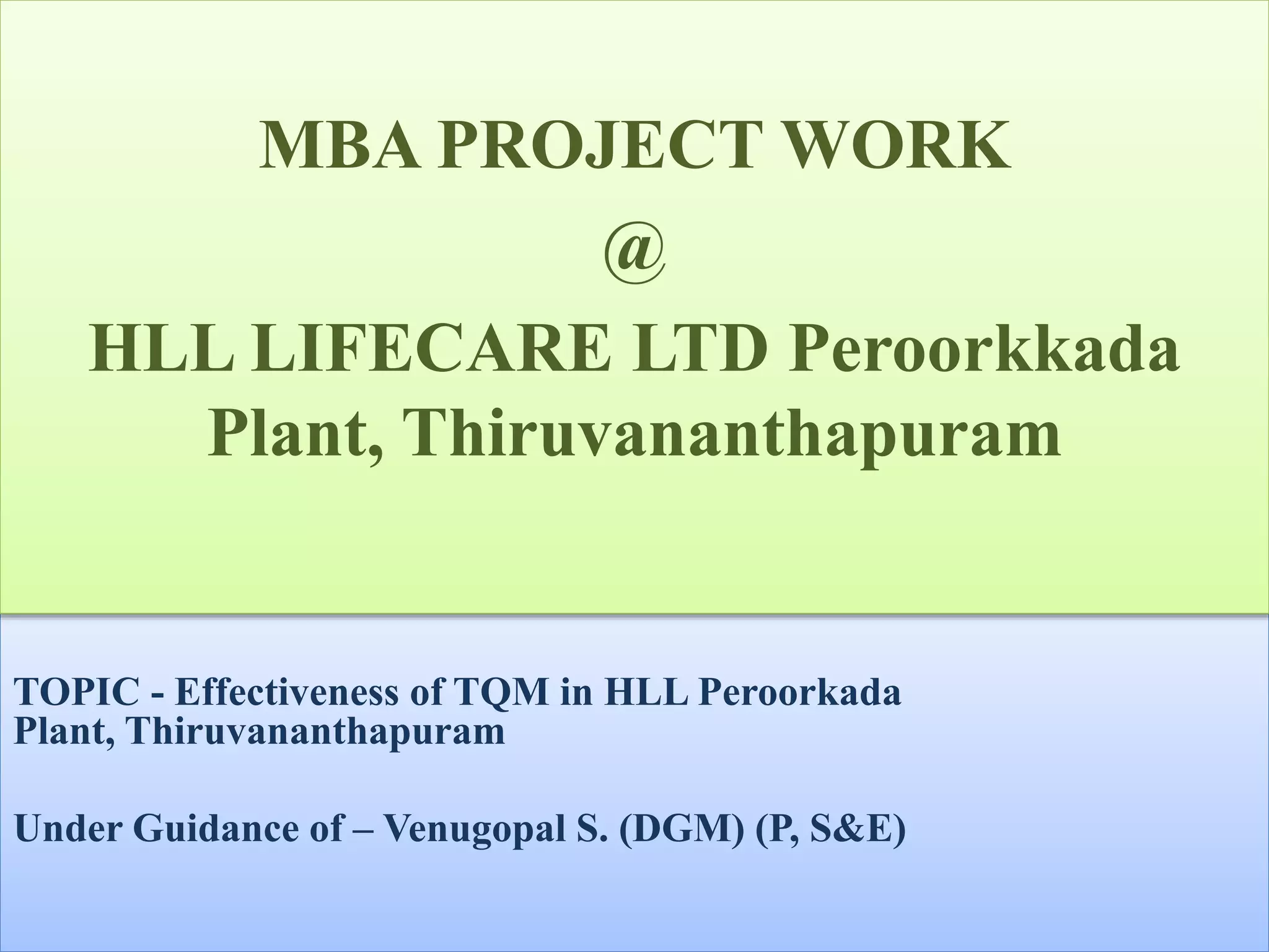 The document presents a study on the effectiveness of Total Quality Management (TQM) at the HLL Peroorkada plant, highlighting its operational structure, quality certifications, and research methodology. It identifies key factors influencing employee effectiveness, teamwork, and product quality, supported by statistical analysis using chi-square tests. The findings suggest that while the current quality system is satisfactory, there are opportunities for improvement through employee training, automation, and benchmarking practices.
