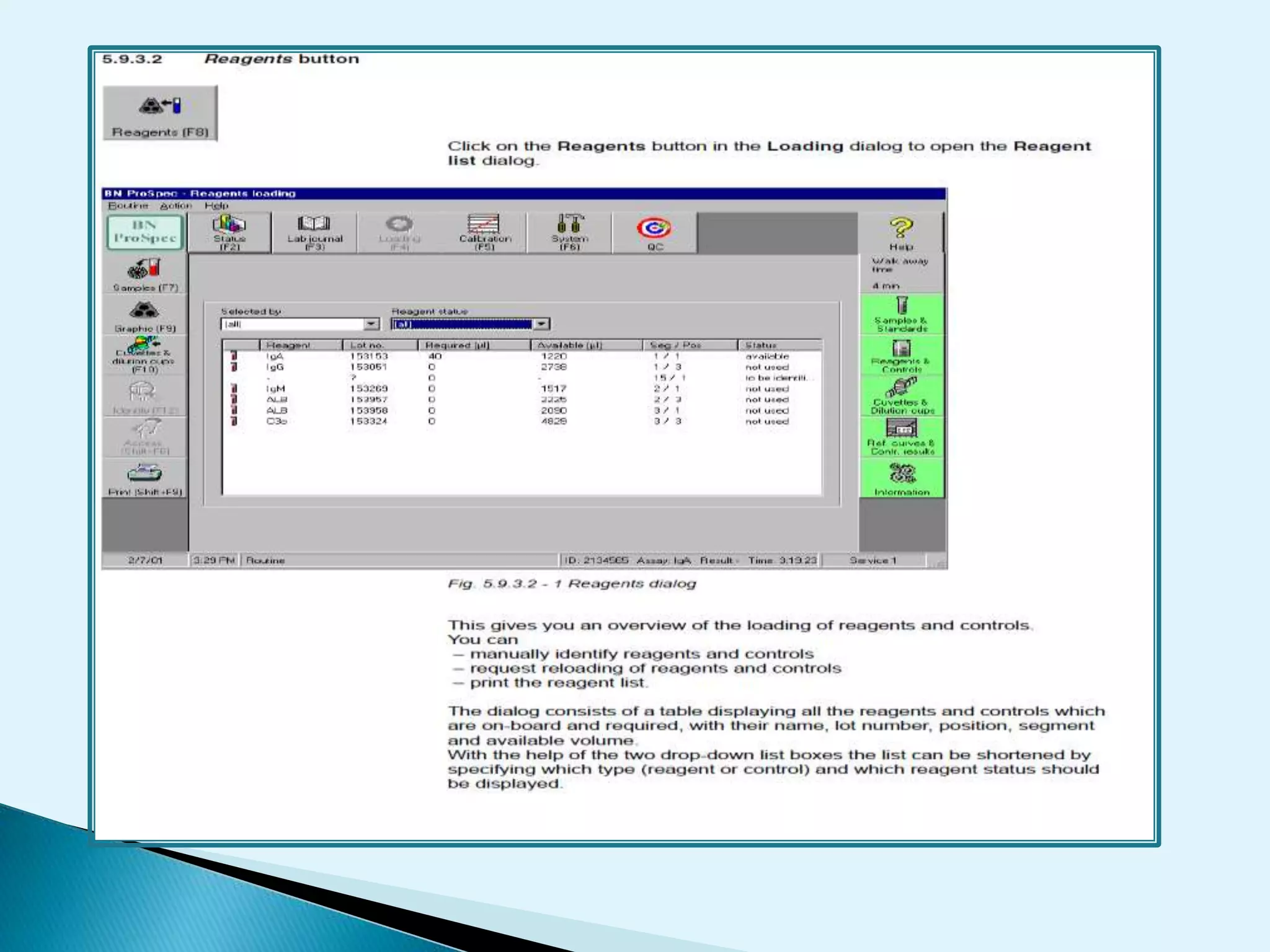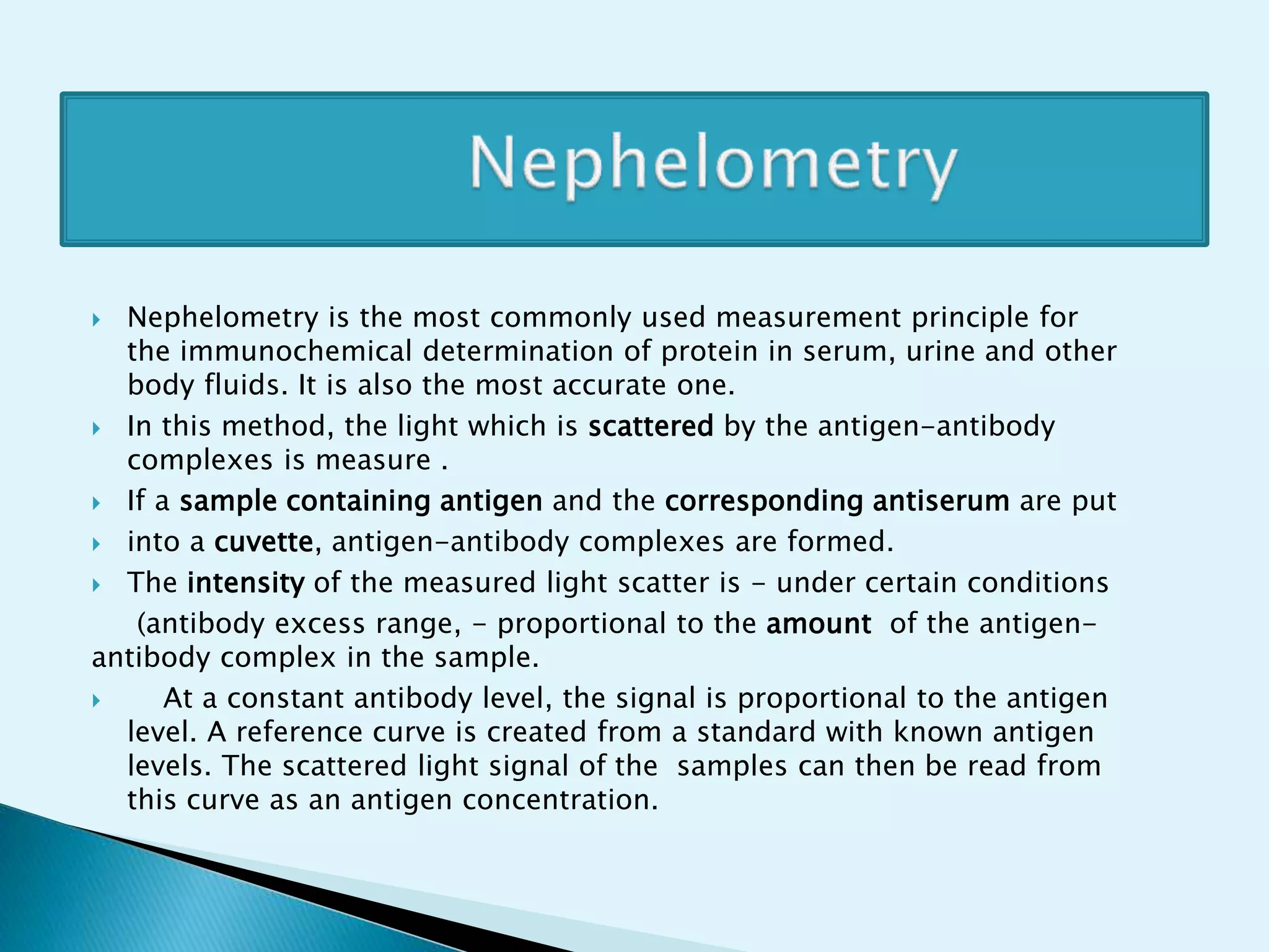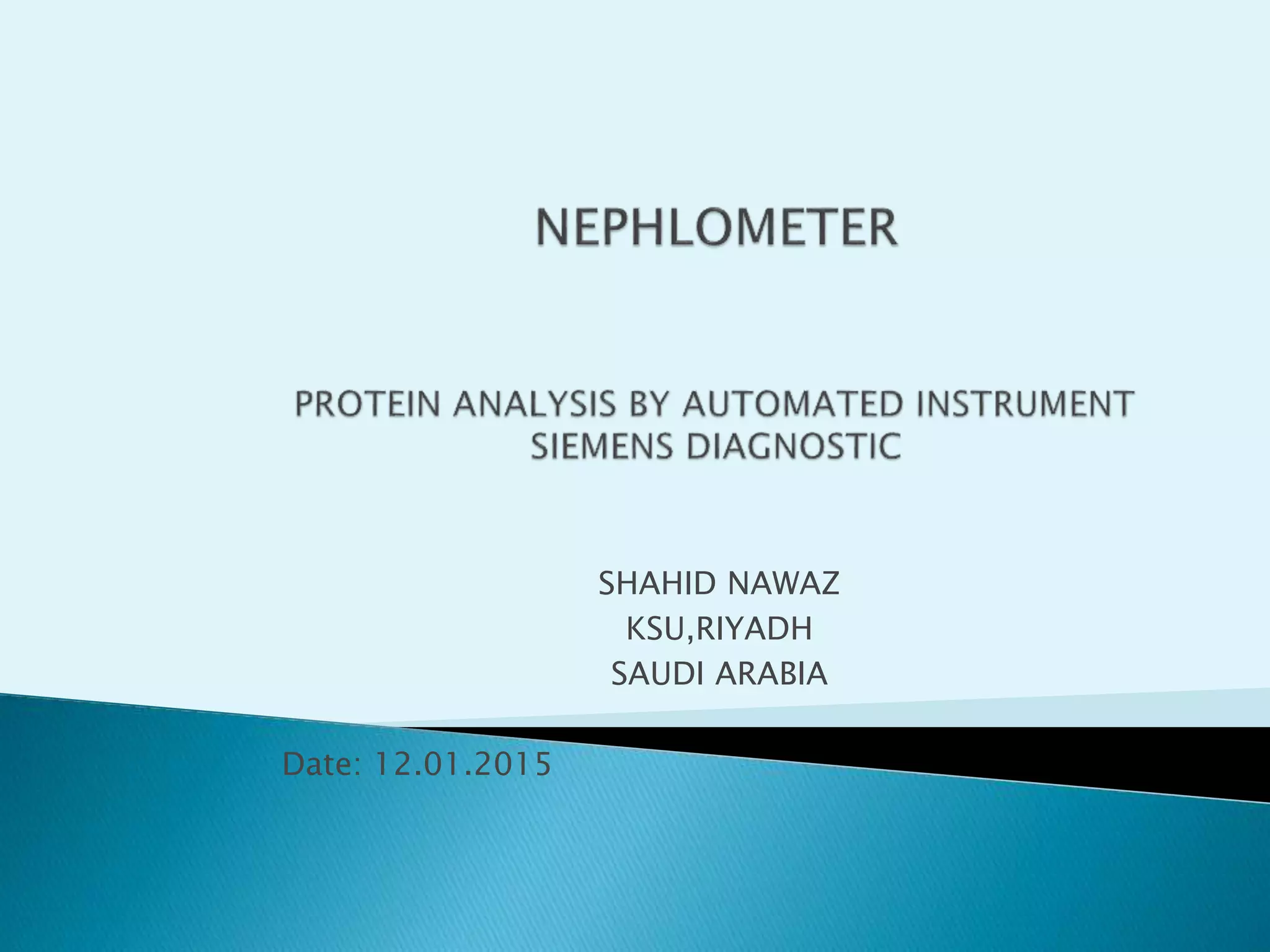 Nephelometry is commonly used to determine protein levels in body fluids like serum and urine. It works by measuring the light scattered by antigen-antibody complexes formed when a sample containing antigen is mixed with corresponding antiserum. The amount of light scattered is proportional to the antigen concentration in the sample. This document provides instructions for using a nephelometer to test samples for C-reactive protein (CRP) levels, including preparing reagents and standards, running samples, generating a calibration curve from standards, and recording results. CRP levels between 0.0-1.0 mg/dL are considered normal.
