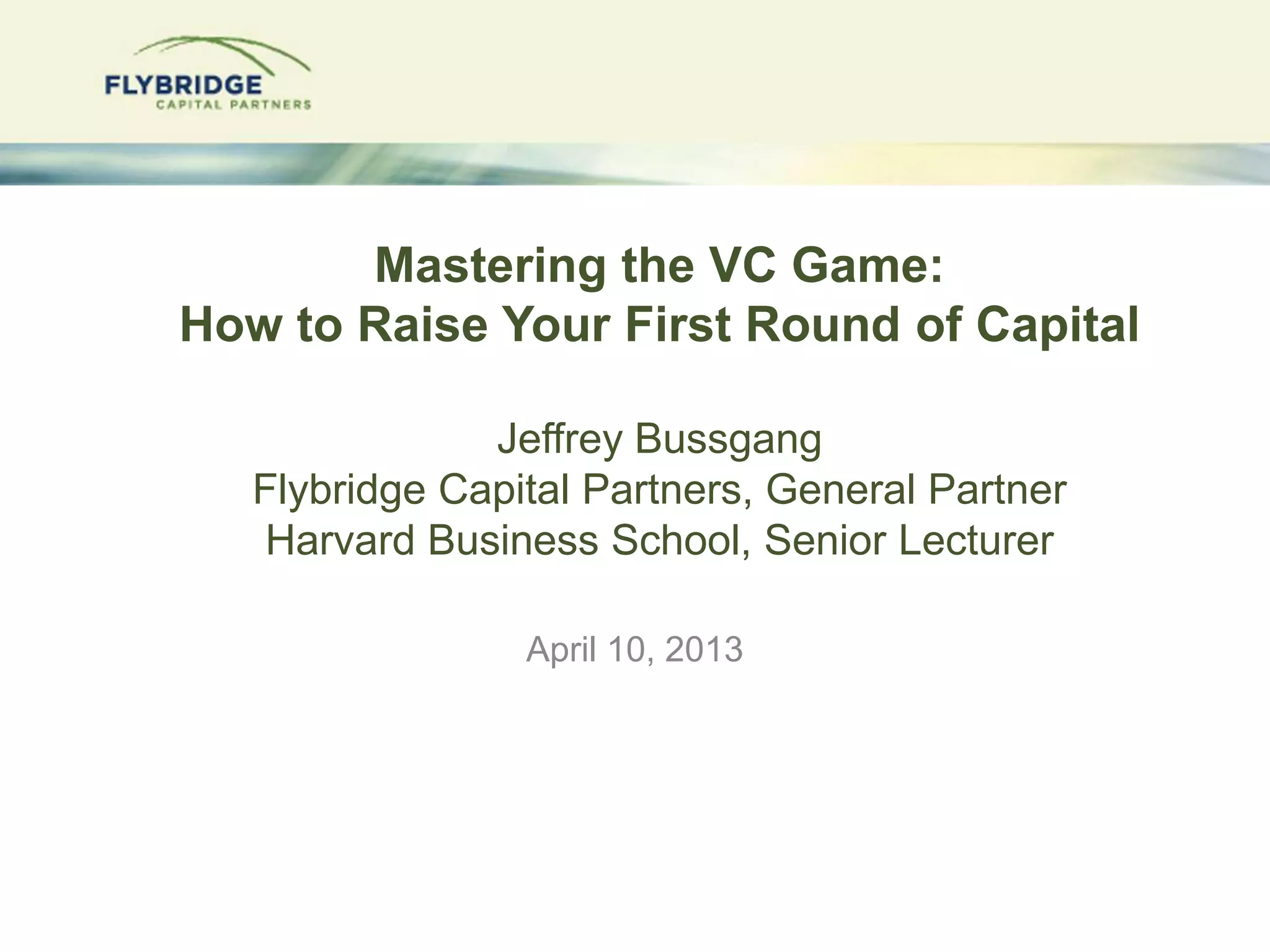 The document is a comprehensive guide on raising initial capital from venture capitalists (VCs) by Jeffrey Bussgang, a general partner at Flybridge Capital Partners. It outlines important considerations for entrepreneurs, including the differences between VCs and angel investors, effective pitching strategies, and key investment criteria. The emphasis is on preparing to stand out, maintaining a professional demeanor, and understanding the rigorous due diligence process that follows initial pitches.
