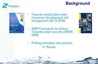 The document discusses the challenges faced by Samoa's water sector, including fragmented management, declining water quality, and insufficient community involvement. It emphasizes the need for a coordinated, integrated approach to sustainable water resource management, highlighting the importance of stakeholder engagement and effective policy development. The strategy aims to enhance public health, community participation, and overall national development through improved water supply and management practices.