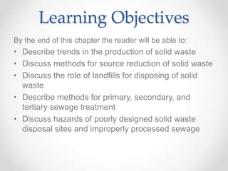 This chapter discusses solid and liquid waste management. It describes trends in municipal solid waste production and methods for reducing, recycling, composting, and disposing of solid waste. Landfills and waste-to-energy facilities are described as primary methods for solid waste disposal. Hazardous waste sources and characteristics are also covered. The key methods discussed for managing wastes are reducing at the source, recycling, composting, waste-to-energy incineration, and disposal in lined landfills.