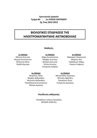 κε και απαντήθηκε από τους μαθητές του σχολείου μας. Το συμπέρασμα που απορρέει από τα αποτελέσματα του ερωτηματολογίου είναι ότι ο κόσμος δεν είναι απόλυτα καταρτισμένος όσον αφορά τους κινδύνους που η ηλεκτρομαγνητική ακτινοβολία εγκυμονεί.