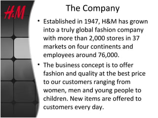 H&M is a global fashion retailer established in 1947 with over 2,000 stores worldwide. They aim to offer fashion and quality at affordable prices to customers of all ages and styles. H&M's marketing strategy currently focuses on in-store promotions but they want to expand their promotional efforts. Implementing social media marketing through platforms like Twitter, Facebook, and blogs could help H&M better engage customers and communicate sales, new items, and the customer experience. Tracking analytics and customer interactions on these channels over a 3-month period would allow H&M to evaluate the effectiveness of their new social media marketing campaign.