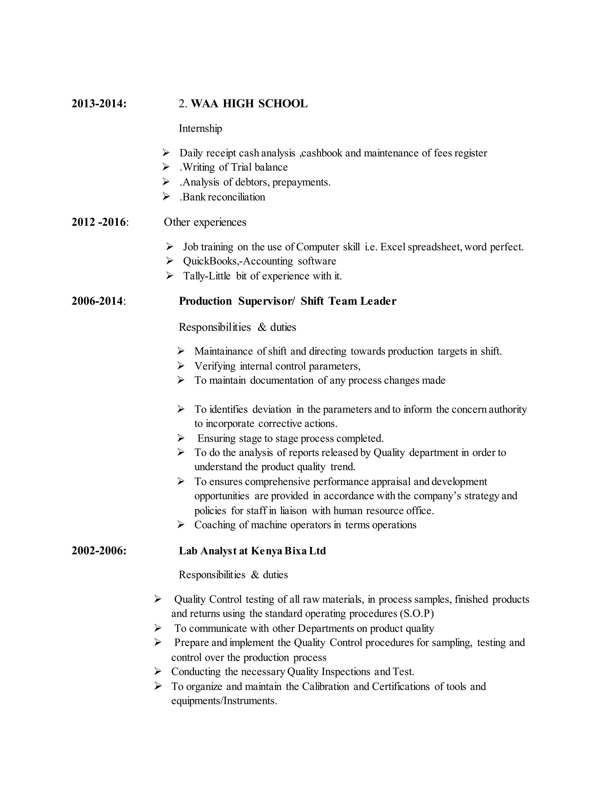 Harold Makau Mwang'ombe is seeking an accountancy position to build on his 11 years of experience as a production supervisor and 2 years as an accountant. He has a Diploma in Chemical Engineering and is a qualified CPA. His most recent role was as an Accountant at Kwale Coconuts Processors Limited where he oversaw accurate recording and analysis of finances, billing, cash handling, and producing reports for management. He also has experience as a Lab Analyst and Production Supervisor.