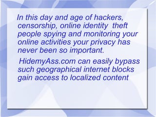 HideMyAss offers various online privacy services, including a free web proxy, VPN, and anonymous email, to protect users from identity theft and online surveillance. Their technology features over 569 servers in 64 countries and employs advanced encryption to secure internet connections. The platform provides tools to surf anonymously, secure file uploads, and hide online identities.