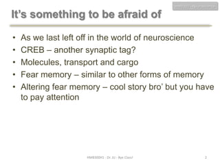 This document discusses neuroscience concepts related to memory and fear learning. It describes experiments using mice that were genetically engineered to express the diphtheria toxin receptor (DTR) in all cells. Viruses were used to target neurons in the lateral amygdala that overexpressed cAMP response element-binding protein (CREB) following fear conditioning. Injecting diphtheria toxin selectively ablated those CREB-overexpressing neurons and erased the previously learned fear memory, demonstrating that CREB plays a key role in fear memory consolidation in the amygdala. The document also reviews other molecules involved in fear memory such as brain-derived neurotrophic factor and discusses technical challenges to studying memory engrams at the neuronal level