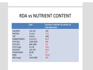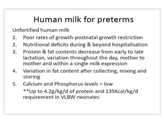 Human milk fortifiers are products that can be added to expressed breast milk to increase its nutritional content for premature infants. There are three main approaches to fortification - standard fixed dosage, adjustable based on blood urea nitrogen levels, and targeted fortification using human milk analysis. Fortifiers provide additional protein, calories, and minerals to help premature infants achieve adequate growth. While fortification benefits growth, high osmolality from fortifiers can cause feed intolerance and risks like necrotizing enterocolitis. Careful monitoring of infants on fortified breast milk is needed to optimize nutrition and growth.