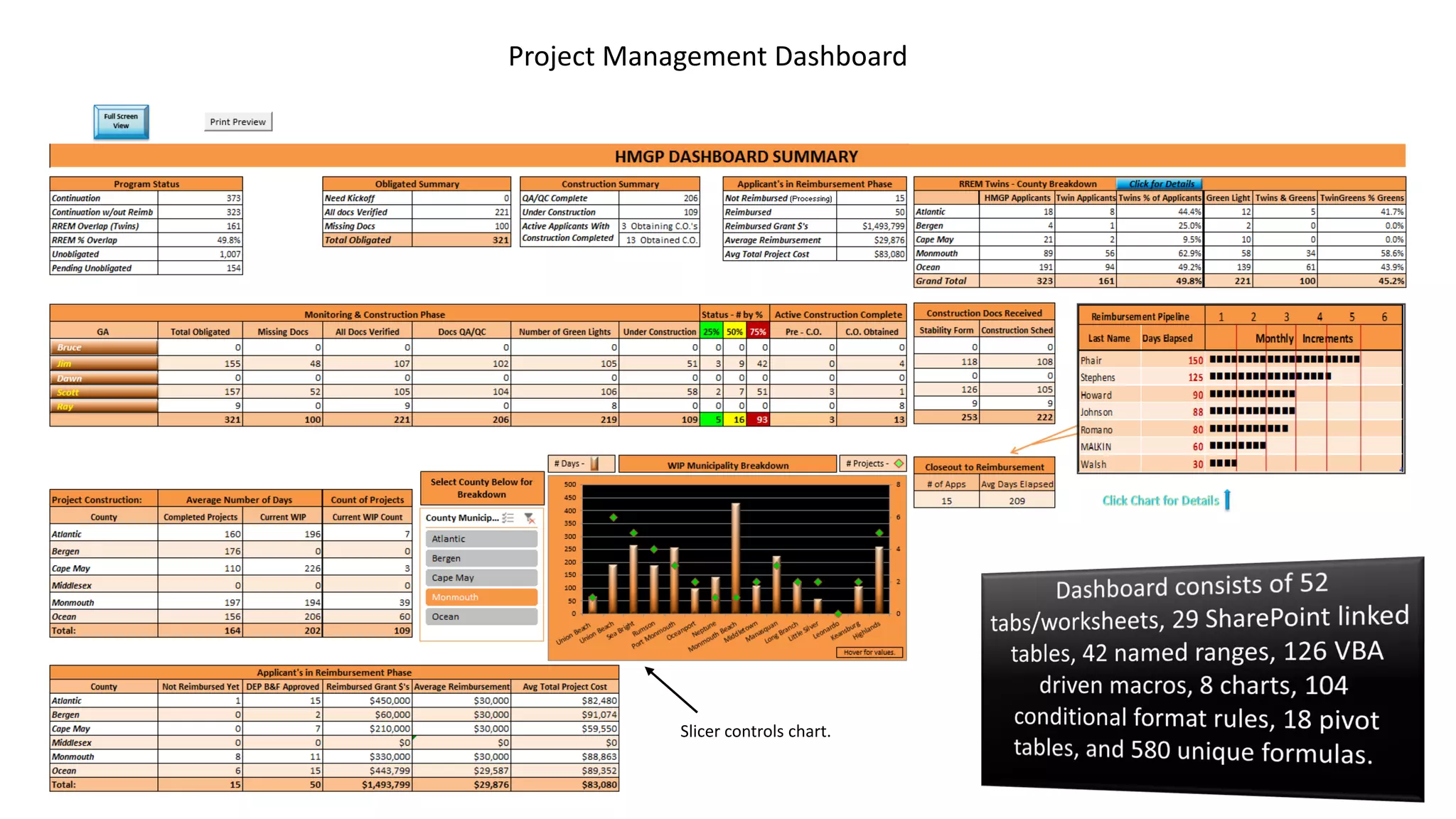 The document describes a project management dashboard that allows users to easily monitor project progress through various interactive visualizations. The dashboard includes slicers and charts to filter data, conditional formatting to spot issues, and alerts for upcoming tasks and milestones. It also enables drilling down into individual pipelines or projects using pivot tables, pivot charts, and links to get additional help with projects.