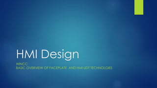 This document discusses faceplate and HMI UDT technologies in WinCC. It explains that a faceplate groups HMI objects into a single reusable object. Faceplates that use an HMI UDT interface only need to be tagged once, saving significant development time. Examples are given of PID, VFD, and analog instrument faceplates created with HMI UDTs that dynamically adapt based on the connected controller tags. The process of creating an HMI UDT, assigning it to a data block, tagging faceplate objects, and using the faceplate is outlined.