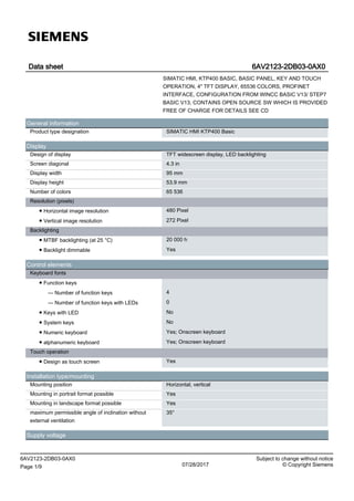 The SIMATIC HMI KTP400 Basic is a 4.3 inch TFT display panel with a PROFINET interface. It has a 65,536 color display, 4 function keys, and supports configuration from WinCC Basic V13 and STEP7 Basic V13. It is IP65 rated and supports various industrial protocols including PROFINET, TCP/IP, DHCP, and EtherNet/IP.