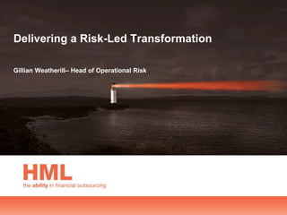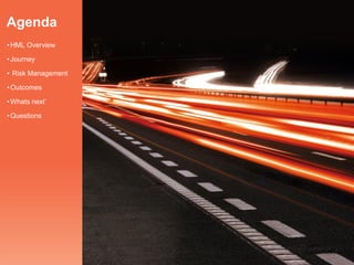 The document outlines HML's transformation in operational risk management, highlighting the effectiveness of its risk management framework and addressing gaps in past approaches. It shows a significant reduction in operational losses and an improvement in risk compliance, supported by a structured process and technology integration. The overall goal is to align risk management with business strategy to achieve sustainable objectives while minimizing potential threats.