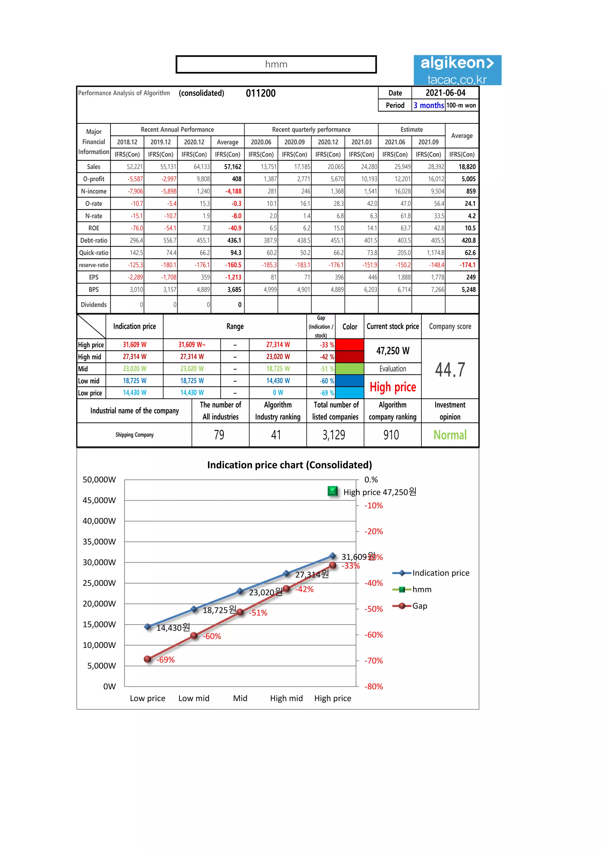 This document provides a performance analysis of the Algorithm company over several periods from 2018-2021. It includes key financial metrics such as sales, operating profit, net income, operating rate, net rate, and debt ratio. It also analyzes the company's stock price performance and provides an indication price range. Additional sections provide trading strategy recommendations, including suggested purchase amounts and price ranges to buy stock. The document is intended to help users make investment decisions but notes the analysis may change over time and the user is responsible for investment outcomes.