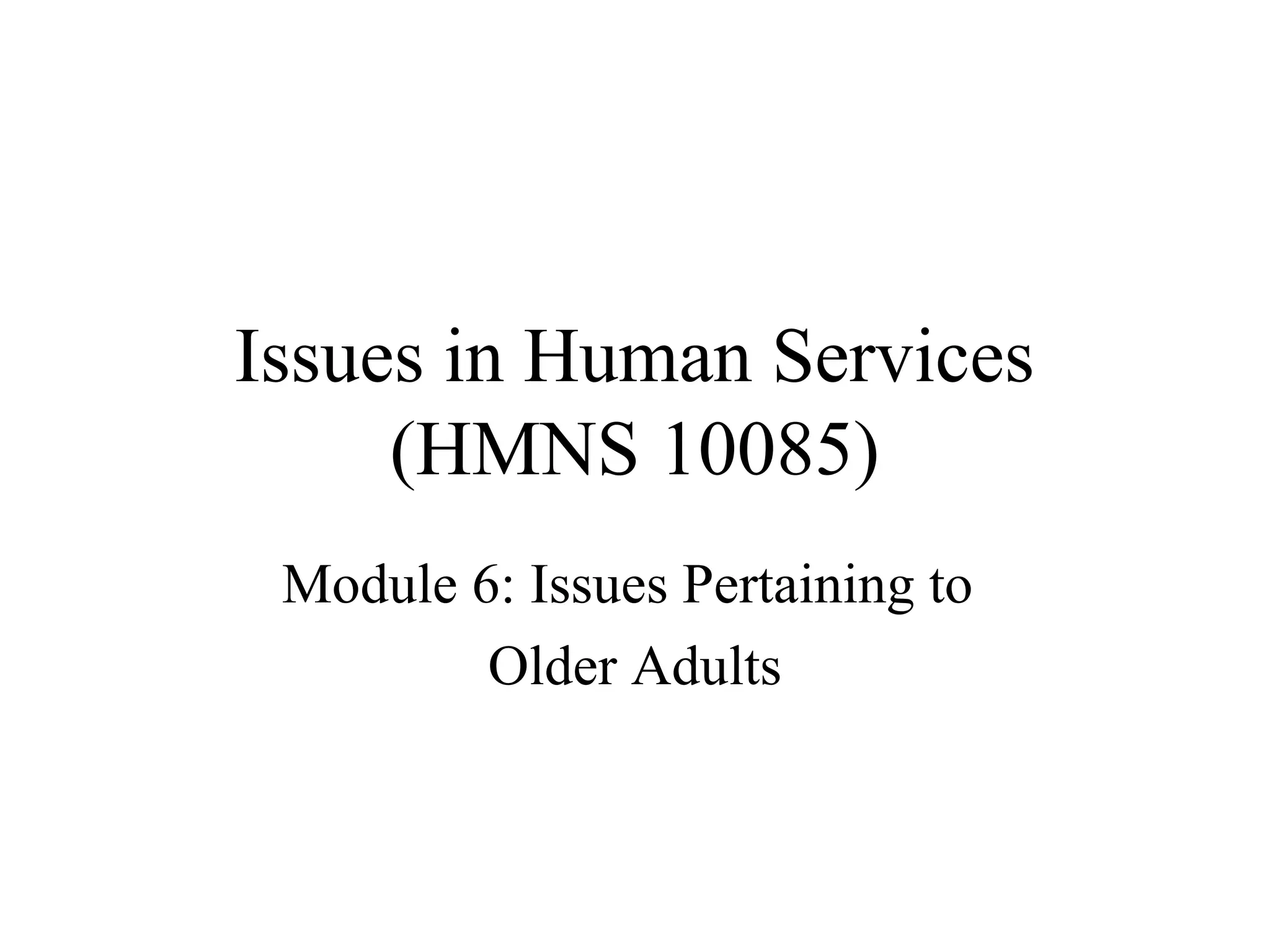 This document defines different categories of older adulthood and discusses issues pertaining to aging populations. It notes that the percentage of Canadians over age 65 has been increasing and is projected to reach 18.9% by 2021 due to longer life expectancies and lower birth rates. The document also discusses health problems that are more common in older adults such as mobility issues, vision problems, and memory loss. Additionally, it examines the needs of older adults for care at home or in long-term care facilities, caregiver stress, and rights of older adults in institutional settings. Income sources for older Canadians such as Old Age Security, Canada Pension Plan and Guaranteed Income Supplement are also outlined. Vulnerable groups facing higher risks of poverty