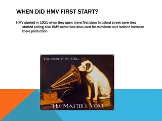 HMV started in 1921 with their first store in Oxford Street selling records and using their name for radio and television production. HMV stands for "His Master's Voice", inspired by the painting of the same name showing a dog named Nipper listening to a phonograph. While their original logo depicted this dog, the logo has changed over time as HMV stores have also evolved, originally selling only records and later DVDs, Blu-rays, and more as technology advanced.