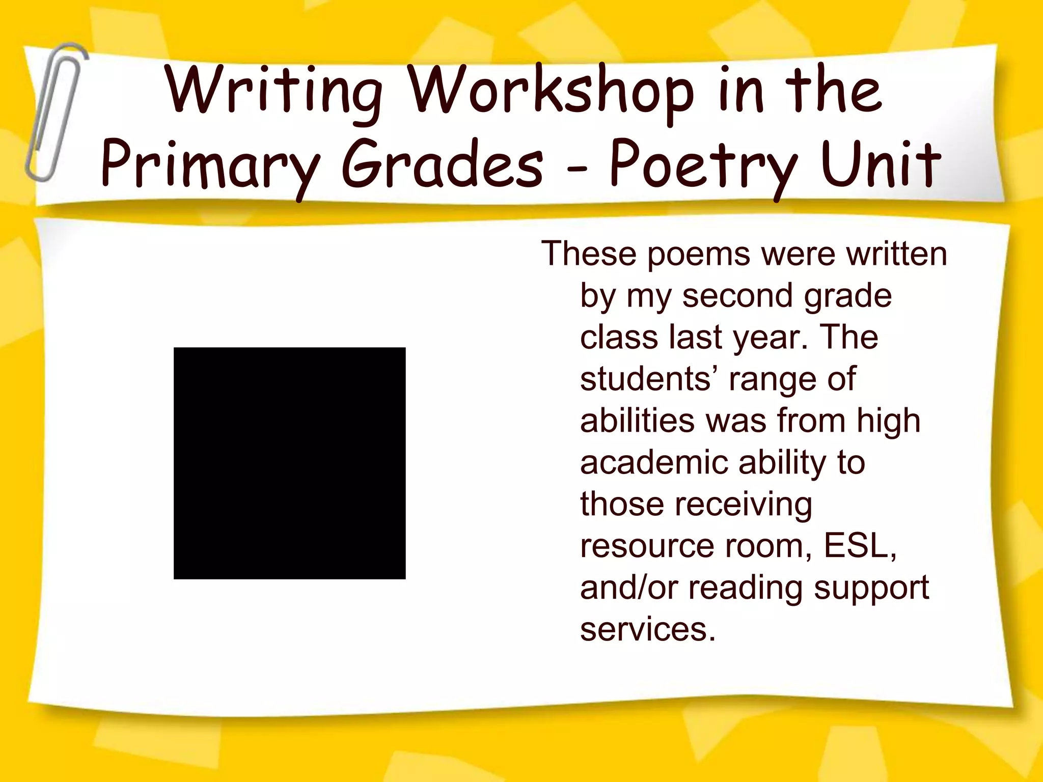 The document provides an overview for a 2-5 week poetry unit for primary grades. It includes suggestions for immersing students in poetry through read alouds, mini lessons on poetic techniques, and conferring during the writing process. Students then edit, revise, publish and celebrate their poems. The goal is to nurture students' love of poetry and help them generate ideas while learning craft elements.