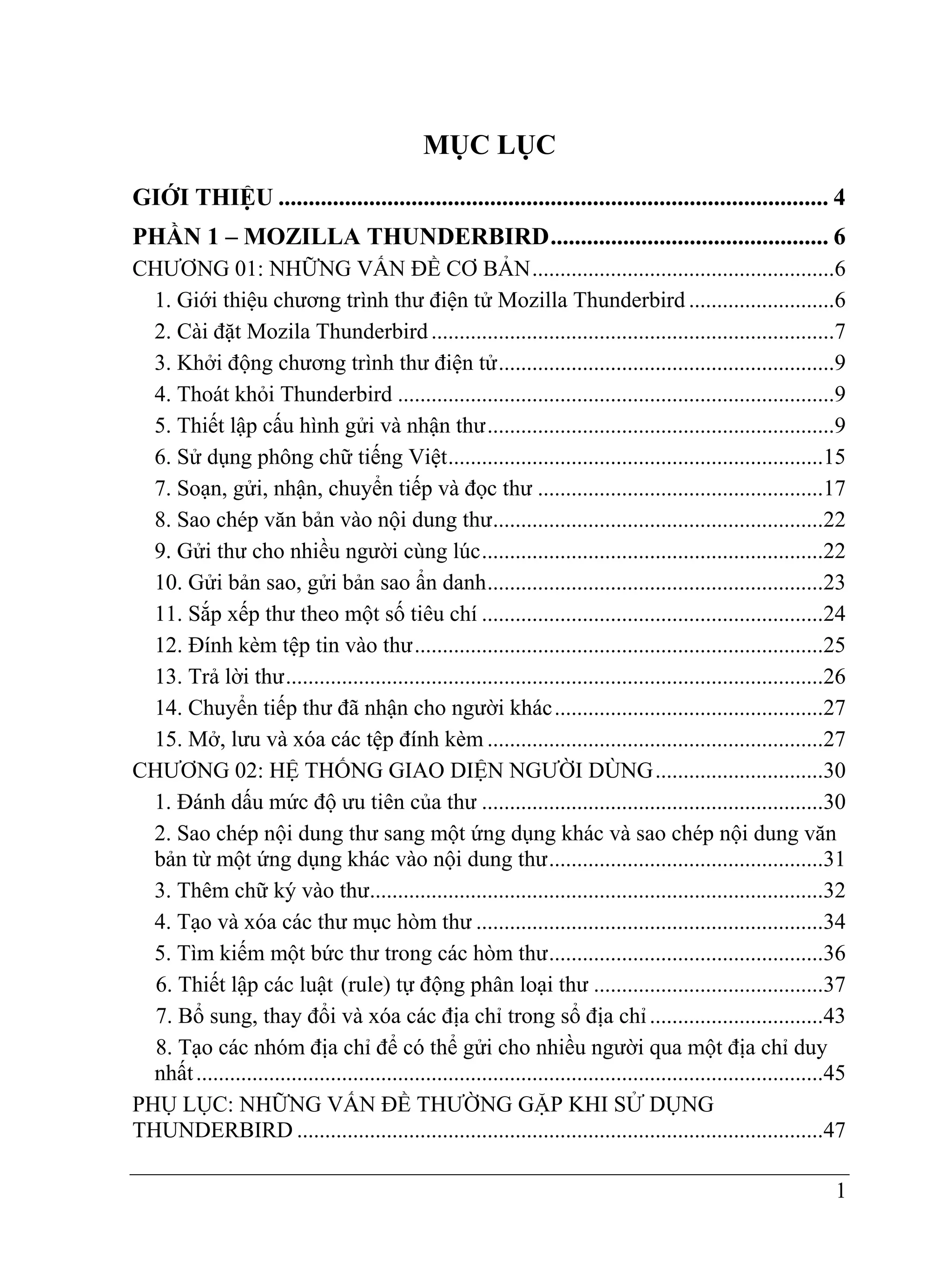 Tài liệu hướng dẫn sử dụng các phần mềm Mozilla Thunderbird, Mozilla Firefox và Unikey, giúp người dùng cài đặt và làm quen với các tính năng chính của từng phần mềm. Nó cung cấp hướng dẫn chi tiết về cách gửi, nhận thư trong Thunderbird, duyệt web trên Firefox, và gõ tiếng Việt bằng Unikey. Tài liệu cũng đề cập đến các vấn đề thường gặp và cách khắc phục.