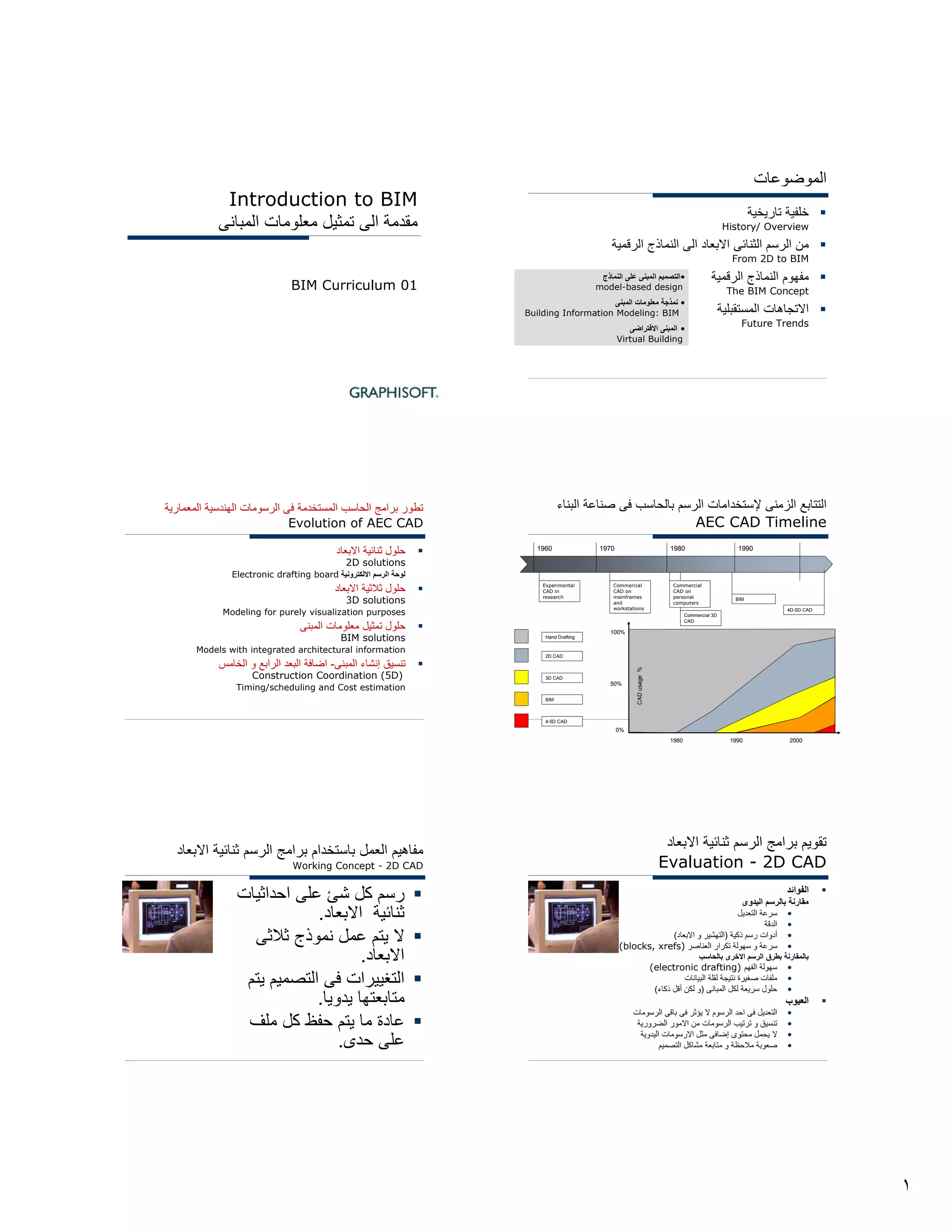The document provides an introduction and history of Building Information Modeling (BIM). It discusses the evolution from 2D drafting to 3D and BIM solutions. Key points include the transition from paper drafts to digital models that integrate architectural information. Future trends discussed are model-based design, building information modeling (BIM), and virtual buildings.