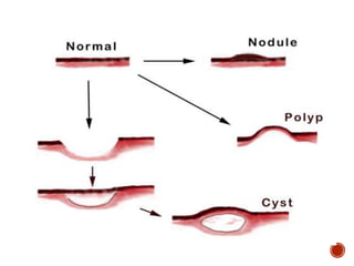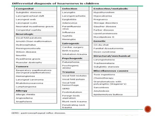 The document describes the anatomy and physiology of the larynx. It discusses the cartilages that make up the larynx, including the thyroid, cricoid, and epiglottis cartilages. It also describes the intrinsic and extrinsic membranes of the larynx. Furthermore, it discusses the functions of the larynx in phonation, respiration, and protection of the lower airways. It outlines common laryngeal pathologies like laryngitis and their causes, symptoms, and treatments.