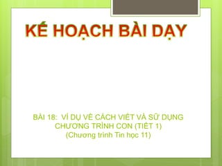 Tài liệu trình bày về kịch bản dạy học chương trình con trong môn Tin học 11, bao gồm các khái niệm cơ bản về lập trình, cấu trúc và cách sử dụng chương trình con. Các mục tiêu kỹ năng và kiến thức được xác định rõ, cùng với các hoạt động dạy học cụ thể nhằm giúp học sinh hiểu và áp dụng hiệu quả. Tài liệu cũng liệt kê các thiết bị và đồ dùng cần thiết cho việc dạy học.