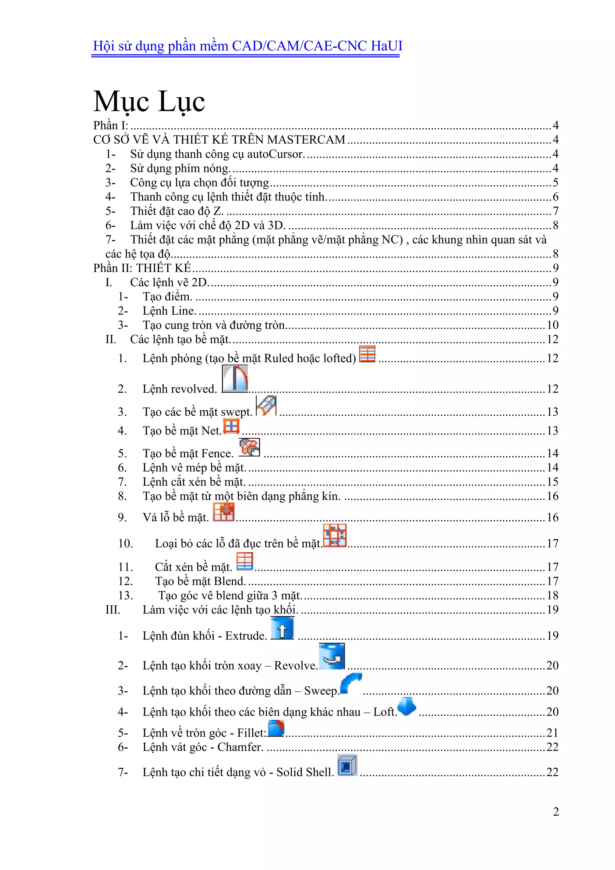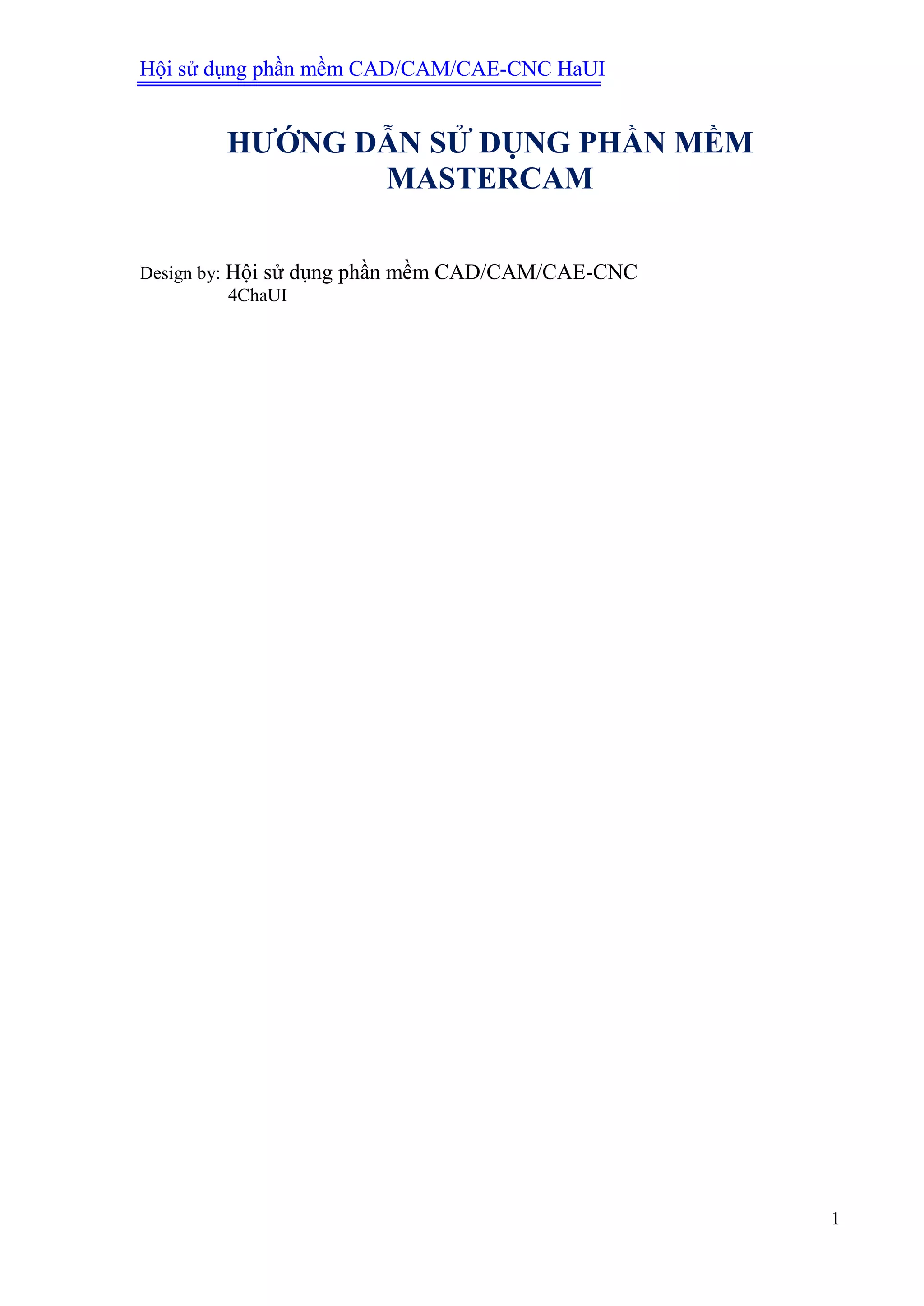 Tài liệu hướng dẫn sử dụng phần mềm Mastercam dành cho việc thiết kế và lập trình gia công CNC, cung cấp các công cụ và lệnh cơ bản để vẽ 2D, tạo bề mặt và khối. Nó bao gồm các phần như thiết lập thuộc tính, làm việc với cao độ Z, và cách lập trình CNC chi tiết. Tài liệu này còn chứa hướng dẫn về cách sử dụng thanh công cụ và các phím tắt hữu ích trong Mastercam.