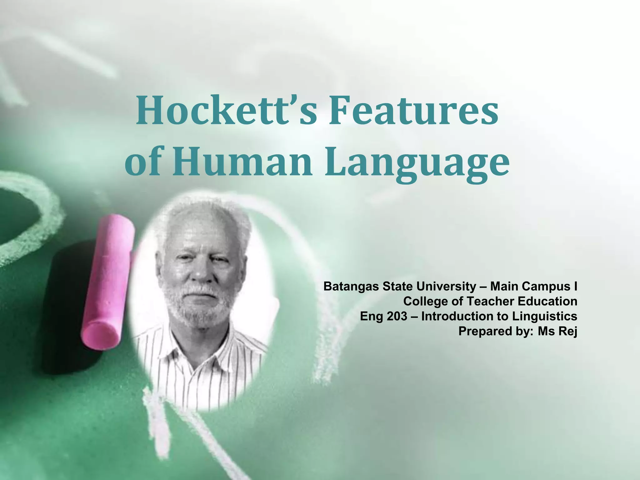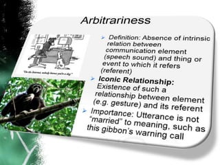 The document discusses the key features that distinguish human language from animal communication systems. It notes that while humans and some animals use sounds to communicate, human language has properties like arbitrariness, displacement, creativity, and being learned rather than innate. It also has a dual structure of sounds combining into meaningful units and is highly patterned and structured rather than a simple list of signals.