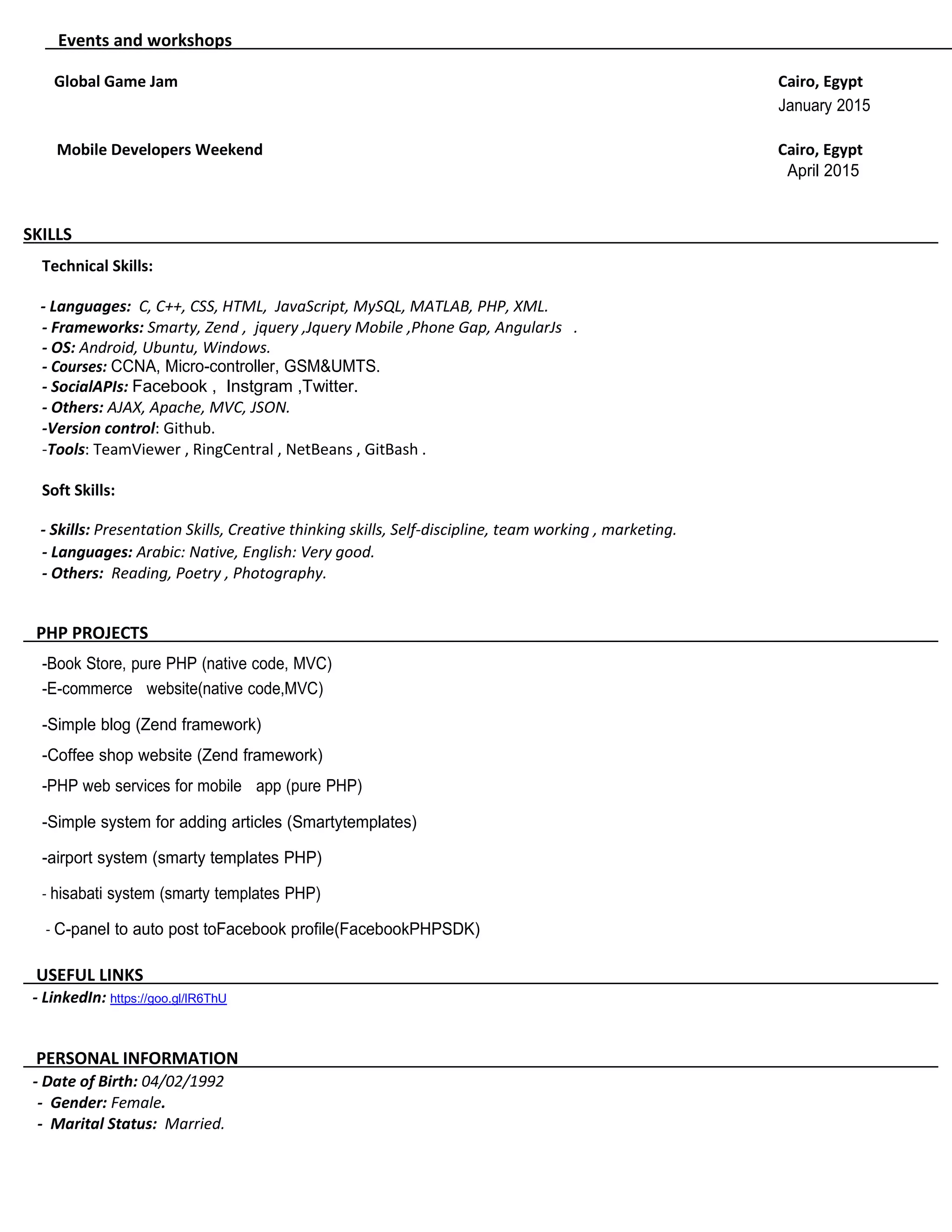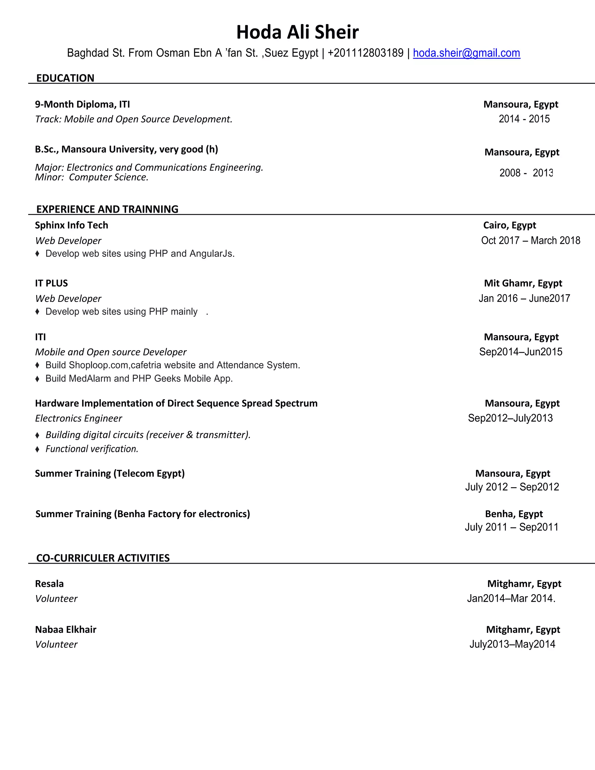 This document is a resume for Hoda Ali Sheir summarizing her education and work experience from 2008 to 2018. She received a 9-month diploma in mobile and open source development from ITI Mansoura in 2014-2015 and a B.Sc. in electronics and communications engineering with a minor in computer science from Mansoura University. Her work experience includes positions as a web developer at Sphinx Info Tech and IT PLUS where she developed websites using PHP and related frameworks. She has also completed various training programs and volunteer activities and lists technical skills in languages, frameworks, and tools for web and mobile development.