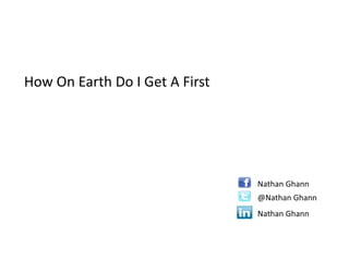 This document provides advice on how to get a first class degree. It begins by outlining the core skills evaluated in degrees: knowledge, understanding, analysis, and evaluation. It then discusses strategies for success like focusing on explanations, lecture note taking, time management, prioritizing high-impact tasks, and developing strong revision skills. Specific tips include breaking down questions, creating a plan, focusing research, getting feedback from lecturers, and practicing past papers to prepare for exams. The overall message is that mastery of the material, self-management, and developing key skills are essential for academic achievement.