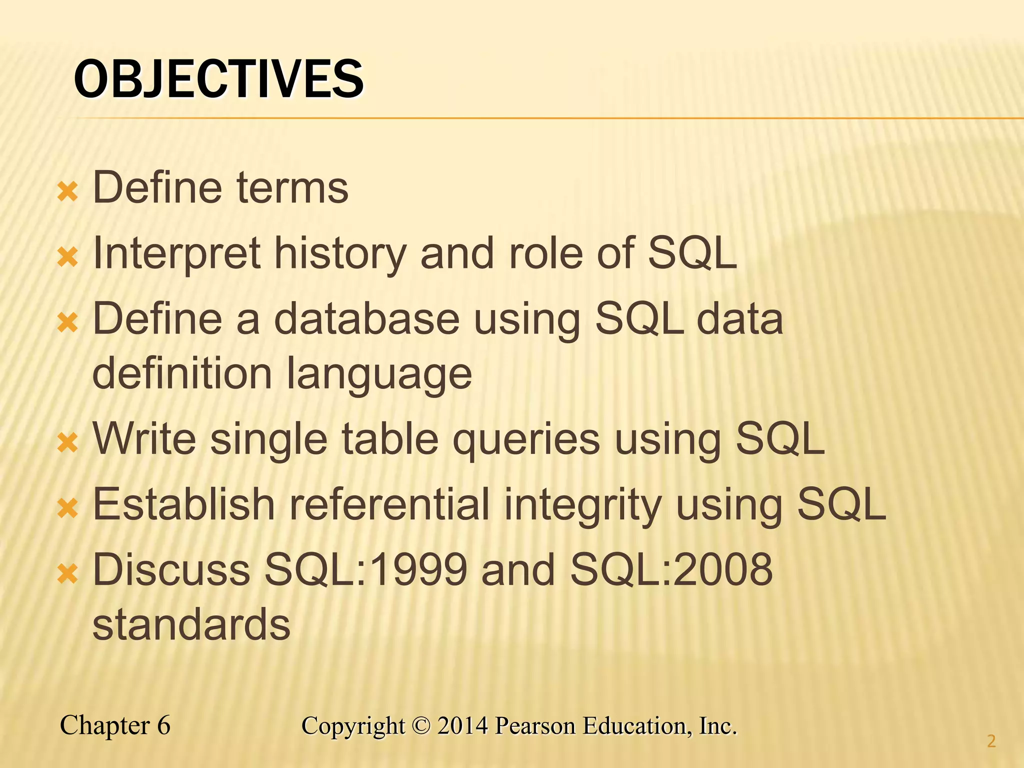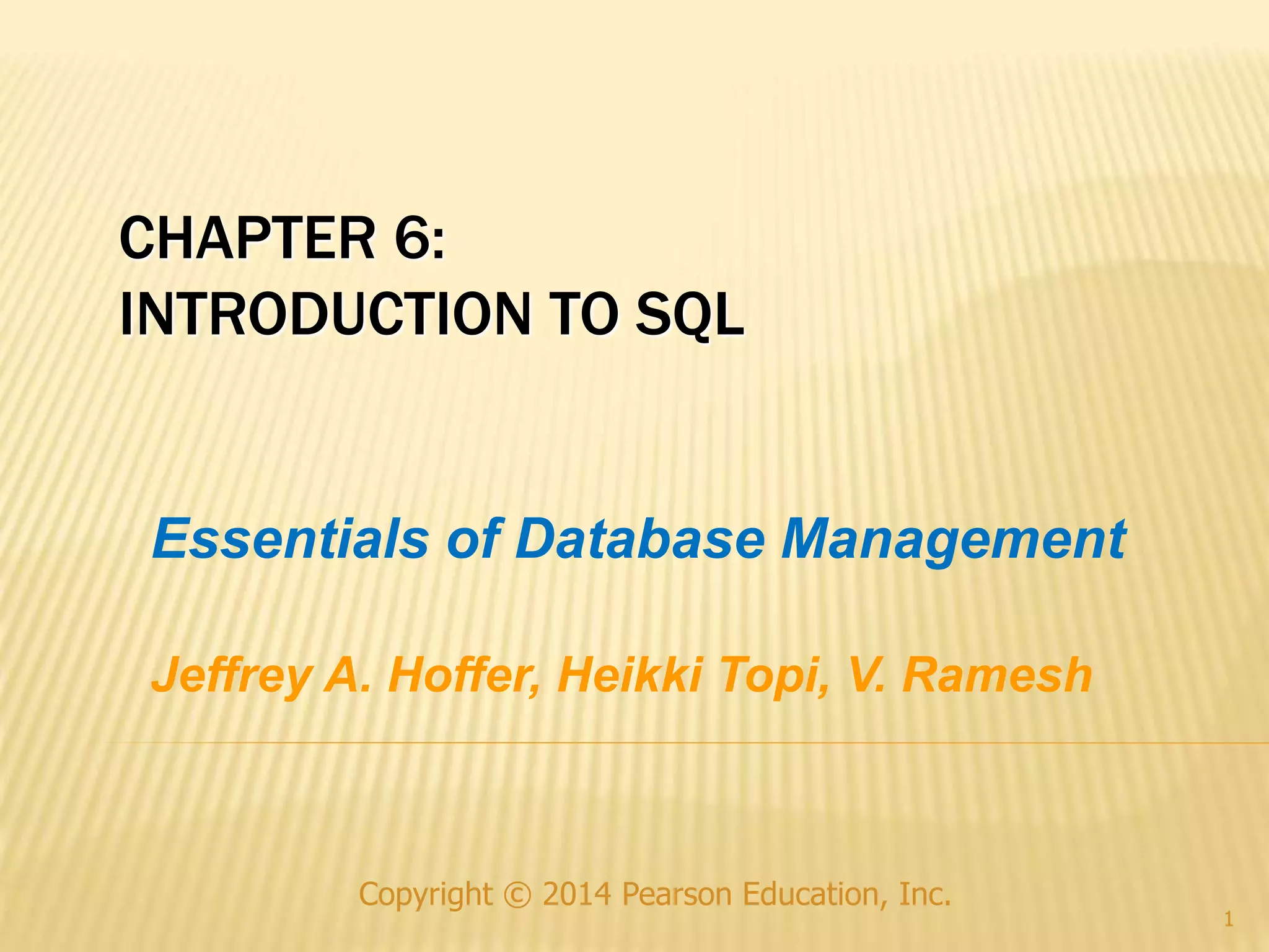 This chapter introduces SQL (Structured Query Language) as the standard language for relational database management systems. It discusses the history and development of SQL, the SQL standards, and the basic components and statements in SQL for defining schemas, querying and manipulating data, and enforcing data integrity. These include the data definition language (DDL) for creating tables, the data manipulation language (DML) for queries, inserts, updates and deletes, and data control language (DCL) for security. Examples are provided to illustrate how to define tables and relationships, and write queries using SQL statements.