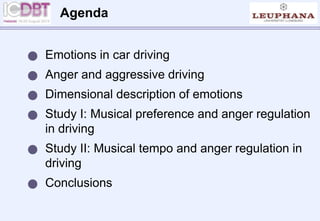 This document summarizes two studies on how music can regulate emotions like anger while driving. The first study found that preferred, positively valenced music reduced feelings of anger after anger-inducing traffic situations, while disliked, negatively valenced music increased anger. The second study found that low tempo music, which induces lower arousal, reduced anger more than no music or high tempo music. Both the valence and arousal dimensions of music were found to influence the intensity of felt anger in drivers. However, the studies did not observe if music's regulation of anger directly impacts driving behavior.
