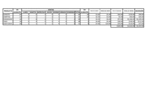 The document shows the weekly sales and profits for various snack products over a 7 day period. It lists the product, price purchased, sale price, total units sold, total profit earned and total sales for each product and the overall investment, earnings and sales for the week. The highest earning products were Rebanadas and Coca-Cola while Gansito and Sabritas sold the most units. Overall the venture earned $2,433 in profits on $2,616 in sales.