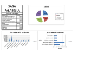 This document lists educational software prices, including an encyclopedia, animal and human body books, and a math game for $45-99. It also lists popular game prices like Age of Empires for $53, Unreal for $45, and Commandos for $59. A chart shows the educational software costs $45-179 and a bar graph compares the game prices.