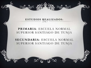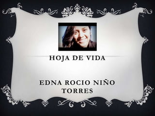 This document is a resume for Edna Rocio Niño Torres. It lists her education which includes primary school at Escuela Normal Superior Santiago de Tunja, secondary school also at Escuela Normal Superior Santiago de Tunja, a customer service course at Cenatunja, and a degree in foreign languages from UPTC Tunja.